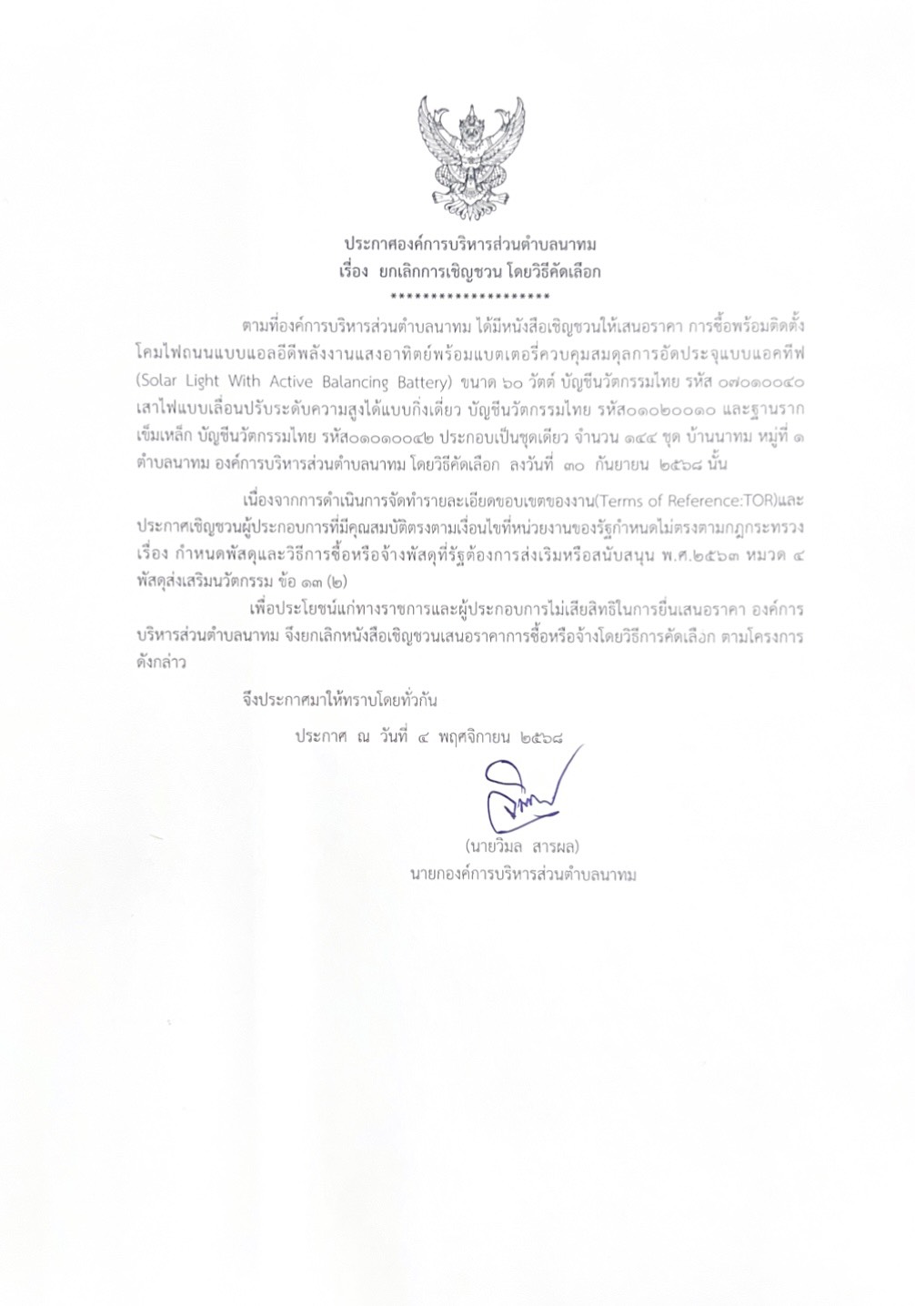 ประกาศยกเลิกการเชิญชวน โดยวิธีคัดเลือก
